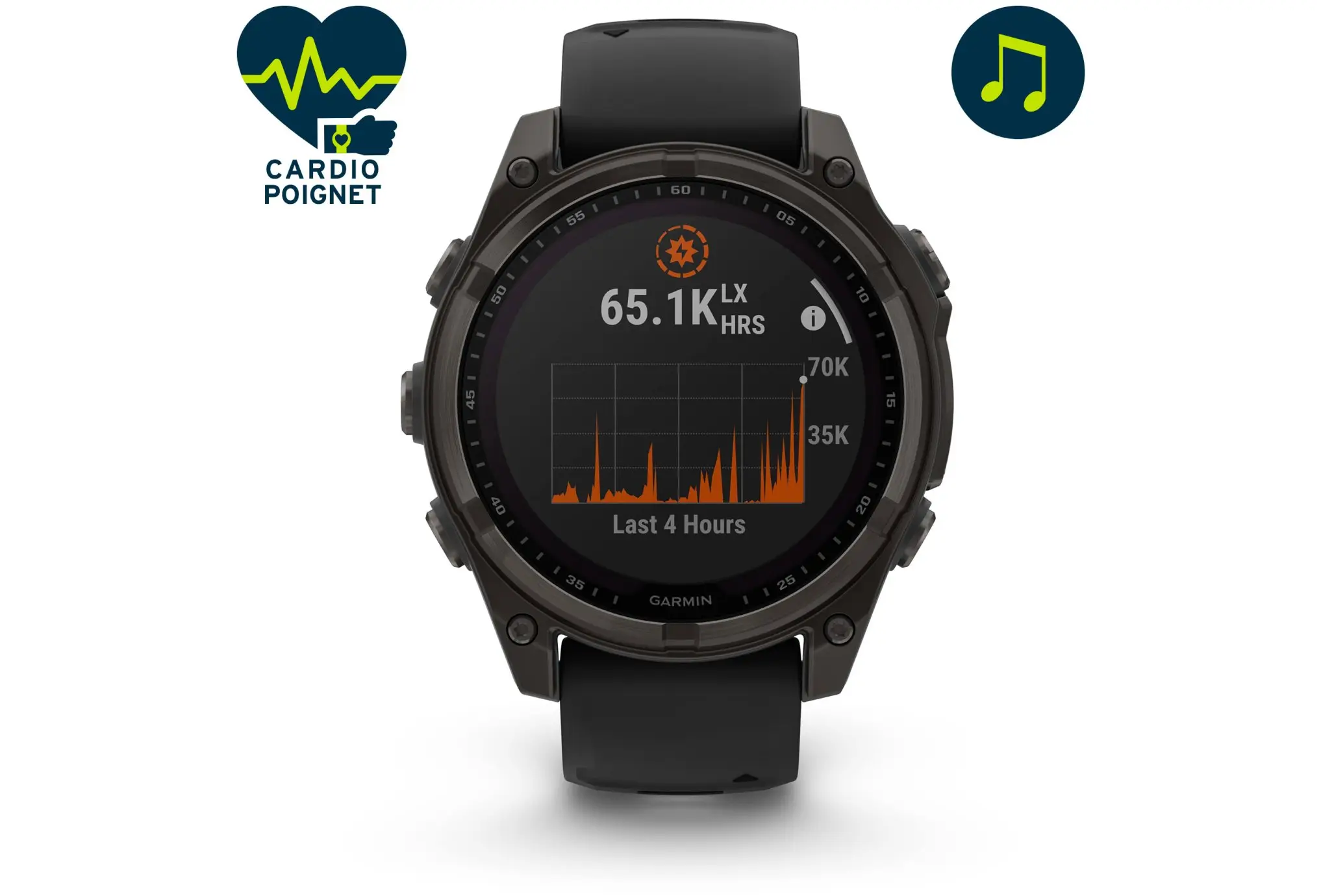 La technologie Solar permet à la montre de se recharger à l’aide de la lumière. Vous bénéficiez ainsi d’une autonomie prolongée. En mode smartwatch, la montre peut fonctionner jusqu’à 22 jours, et jusqu’à 60 heures en mode GPS avec musique.